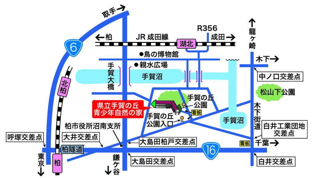 カーナビに自然の家が表示されない場合は、隣接する「手賀の丘公園」を目印においでください。