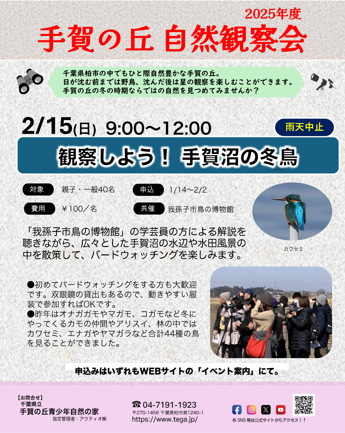 我孫子市鳥の博物館の学芸員の方の解説を聴きながら、広々とした手賀沼周辺を散策し冬の野鳥を観察します。